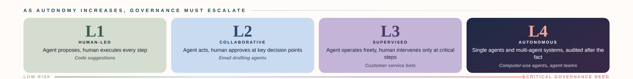 Here’s what concerns me most: the majority of organizations deploying agentic AI today are operating somewhere between Level 2 and Level 3, but their governance frameworks are still designed for Level 1.