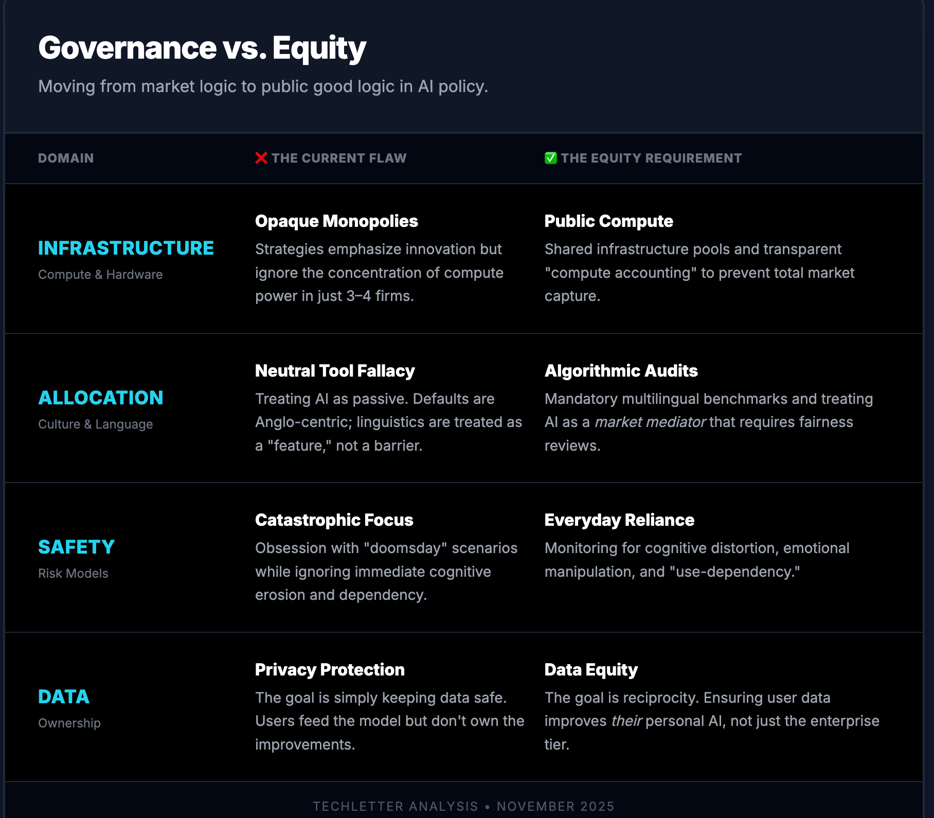 On infrastructure, the current model treats compute power as a scarce commodity controlled by a few firms. An equity-oriented alternative would mandate shared infrastructure pools with transparent ‘compute accounting’ to prevent market capture.