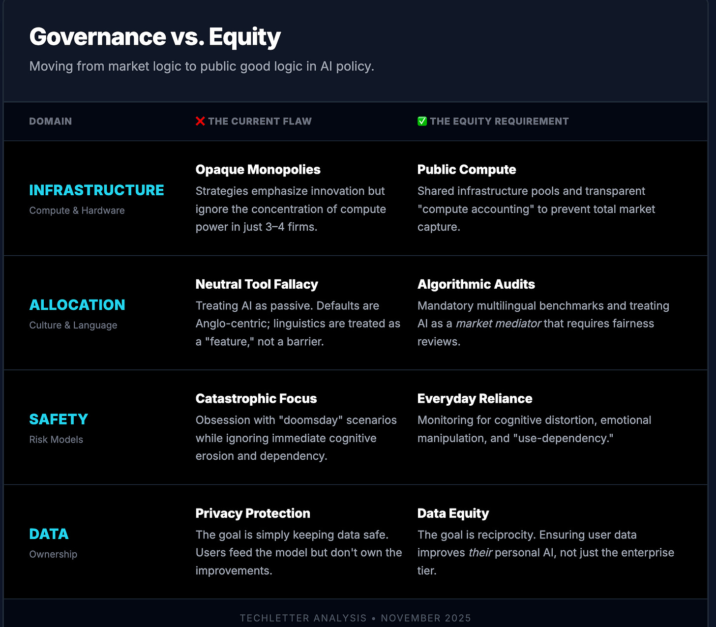 On safety, governance currently fixates on catastrophic scenarios while neglecting everyday harms like cognitive erosion and dependency. Equity demands monitoring systems that track reliance patterns and emotional manipulation.