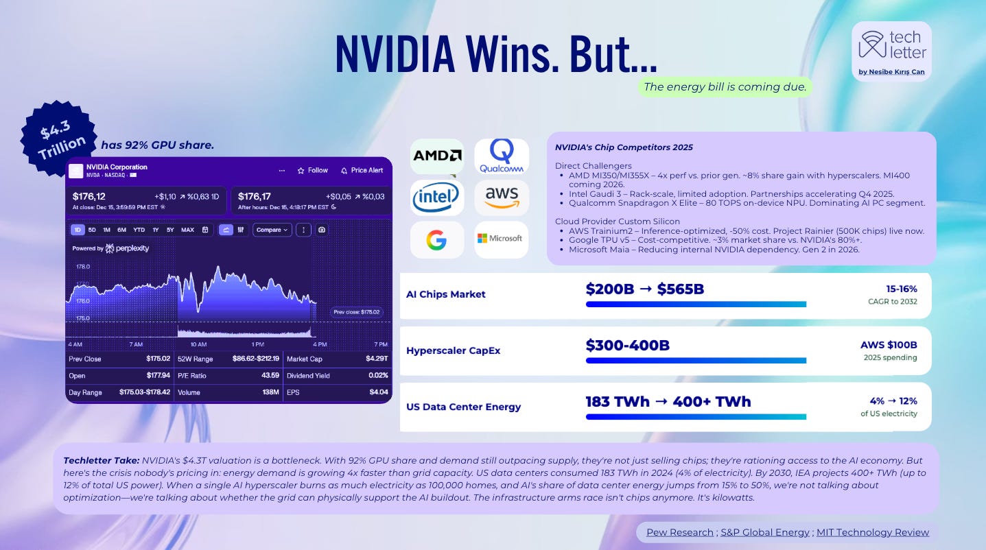NVIDIA is still the chokepoint, but the bigger story is that the AI arms race is quietly turning into a grid problem. When a single hyperscaler can consume electricity at the scale of a small city, “AI strategy” becomes “energy strategy.” And if you’re a business leader, that’s not abstract. It translates into cost volatility, capacity rationing, and an uneven playing field where the winners are the ones who can literally afford to run intelligence.