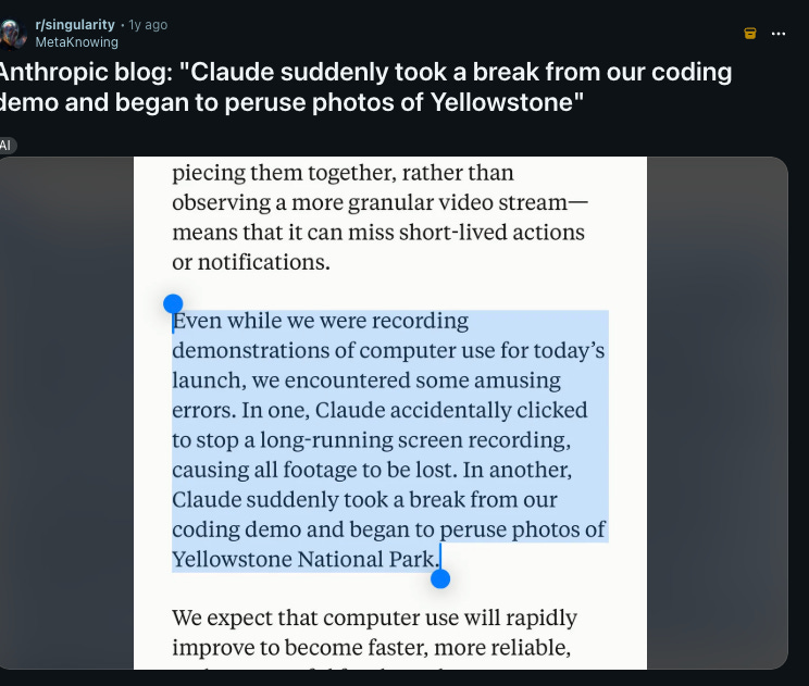In another, Claude suddenly took a break from a coding demo and began browsing photos of Yellowstone National Park