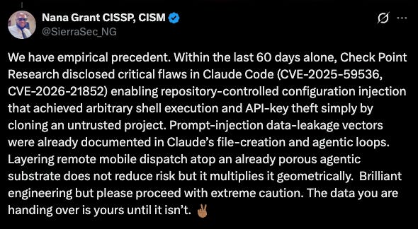 Treat your phone account as the front door. Dispatch assigns tasks from mobile. Strong authentication on your Claude account and your phone is no longer just about account security.