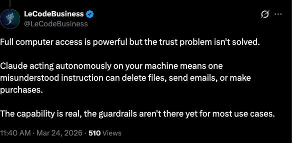 For individual productivity, the upside is real. For regulated sectors, financial workflows, or anything touching personal data at scale, this is not ready infrastructure.