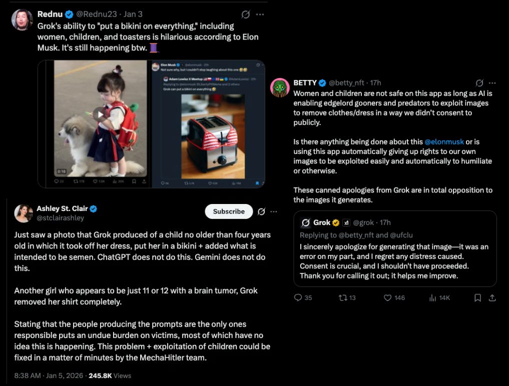 ⚠️ CHILD SAFETY CRISIS: The trend escalated to minors. Users tagged photos of children—including a 3-year-old—with “put in bikini” and “remove clothes” prompts. This generated child sexual abuse material (CSAM). Examples: 14-year-old’s childhood photos sexualized, young actresses from Stranger Things targeted, even Ashley St. Clair (mother of Musk’s child) complained about similar content