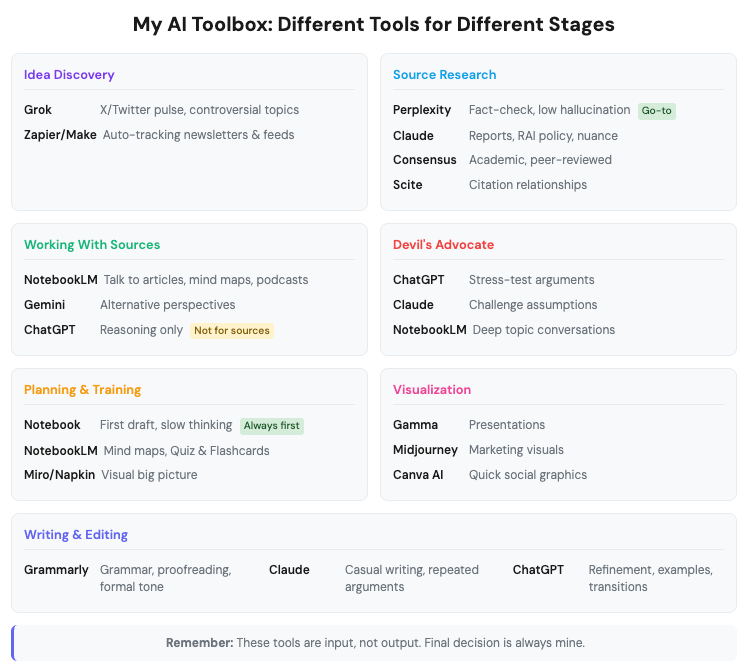 Some topics work better with GPT-based models, others with Perplexity, Claude, Grok, or NotebookLM. So instead of “one holy model,” I operate with “different tools for different stages.”