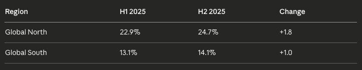 But the more important story is the gap. The distance between the Global North and Global South widened from 9.8 to 10.6 percentage points in just six months, with wealthy countries’ usage growing nearly twice as fast.