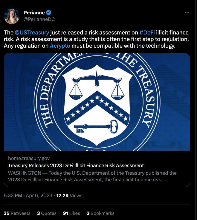 ABD Hazine Bakanlığı, Perşembe günü, merkeziyetsiz finans (DeFi) alanı ile bağlantılı finansal suç uyumu, yaptırımlar, siber suçlar ve kara para aklama riskleriyle ilgili yaygın olarak beklenen bir rapor yayımladı. Rapor, Hazine'nin teknolojiyi yakından incelediğini ve bazı oyuncuların BSA gerekliliklerine uyması gerektiğine inandığını gösteriyor. İleride ne tür RFI ve yönlendirmelerin geleceğini görmek açısından ilginç olacak.