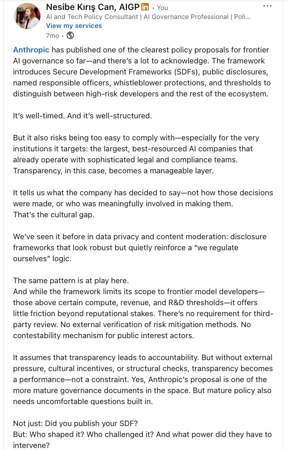 But every one of those documents was self-designed, self-published, and self-enforced. No independent body audits Anthropic’s compliance with its own scaling policy. I have been thinking about this tension for a while. When Anthropic published its Secure Development Frameworks proposal last year, I wrote on LinkedIn that it was well-timed and well-structured, but that it also risked being too easy to comply with, especially for the very labs it targets
