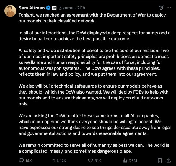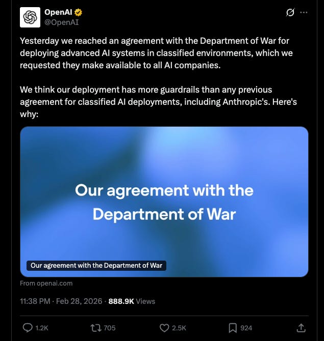 Hours later, OpenAI CEO Sam Altman announced a deal with the Department of War to deploy ChatGPT on classified networks.