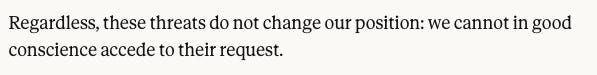Dario Amodei, asked on Friday night if he had a message for the President, said: “Everything we have done has been for the sake of this country. Disagreeing with the government is the most American thing in the world.”