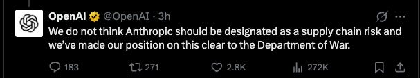 It objects to the punishment while accepting the reward. OpenAI opposes the “supply chain risk” label but does not question the underlying dynamic: that a company was blacklisted for holding ethical red lines, and that OpenAI signed the deal the same day.
