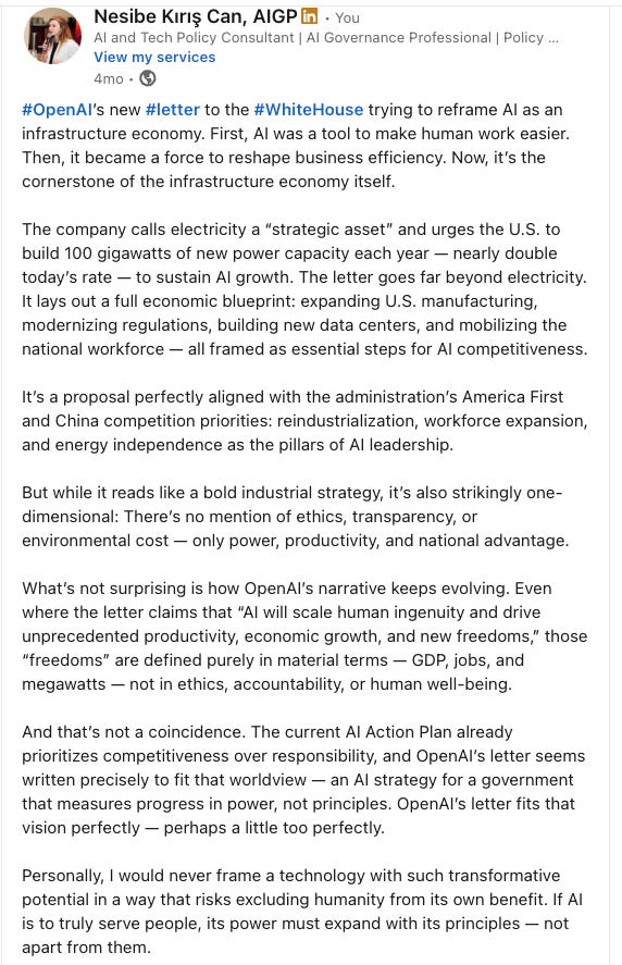 In my analysis of OpenAI’s “infrastructure economy” letter, I noted that the company defines AI progress entirely in material terms: GDP, jobs, megawatts. No ethics, no transparency, no environmental cost.